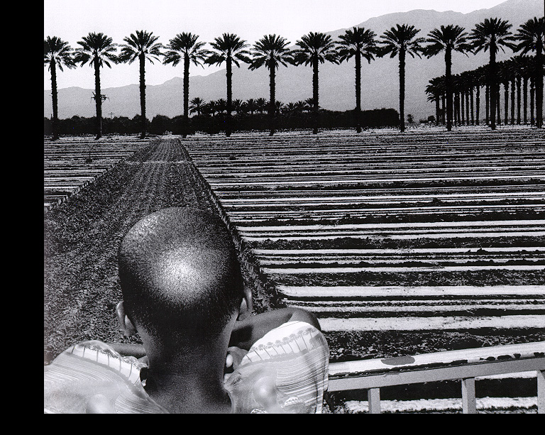 Of Meyer's "American" images, perhaps the most significant are his meditations on California, its importance as the embodiment of the nation's ideals (and, of course, the failure to live up to those ideals). "Plantation, El Centro California 1987 / 1992" depicts a plain of richly plowed earth, with furrows running across the frame as a series of horizontal lines. In the distance, a row of lush palm trees marks the edge of the field, drawing the eye to the horizon. In the foreground, the back of a child's head takes the perspective of the viewer, gazing along the single vertical path leading to the palm trees.