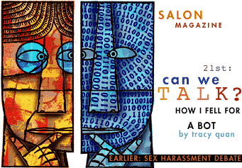 Salon is an interactive on-line "magazine of books, arts and ideas." This web site has articles on news, media, books, music, tv, and travel. "Inside Salon you'll find not only authors and thinkers, but a kinetic community of readers and kindred spirits eager to thrash out cultural issues." The site is organized like a print magazine although the page layout is similar to other on-line ‘zines with text in one narrow column and lots of white space. In addition, Salon has Table Talk, a forum for reader-generated on-line conversations that are associated with the articles. It is primarily a collection of articles, drawings, comics, and games that are all composed for use on the internet. Salon is updated once a week and old editions can be accessed from archives. The intestion of the site to be informative but also playful. It is more for reading and contributing enjoyment than for reference or pedagogical purposes. For the most part, Salon is self-contained, although they do have one page of outside links that are "Favorite Links." I think the intention of the creators was to keep browsers at this particular site. They want readers to enjoy the site like they would enjoy a magazine. They want the browsers to read the literature and then, if they wish, contribute to the on-line discussions.